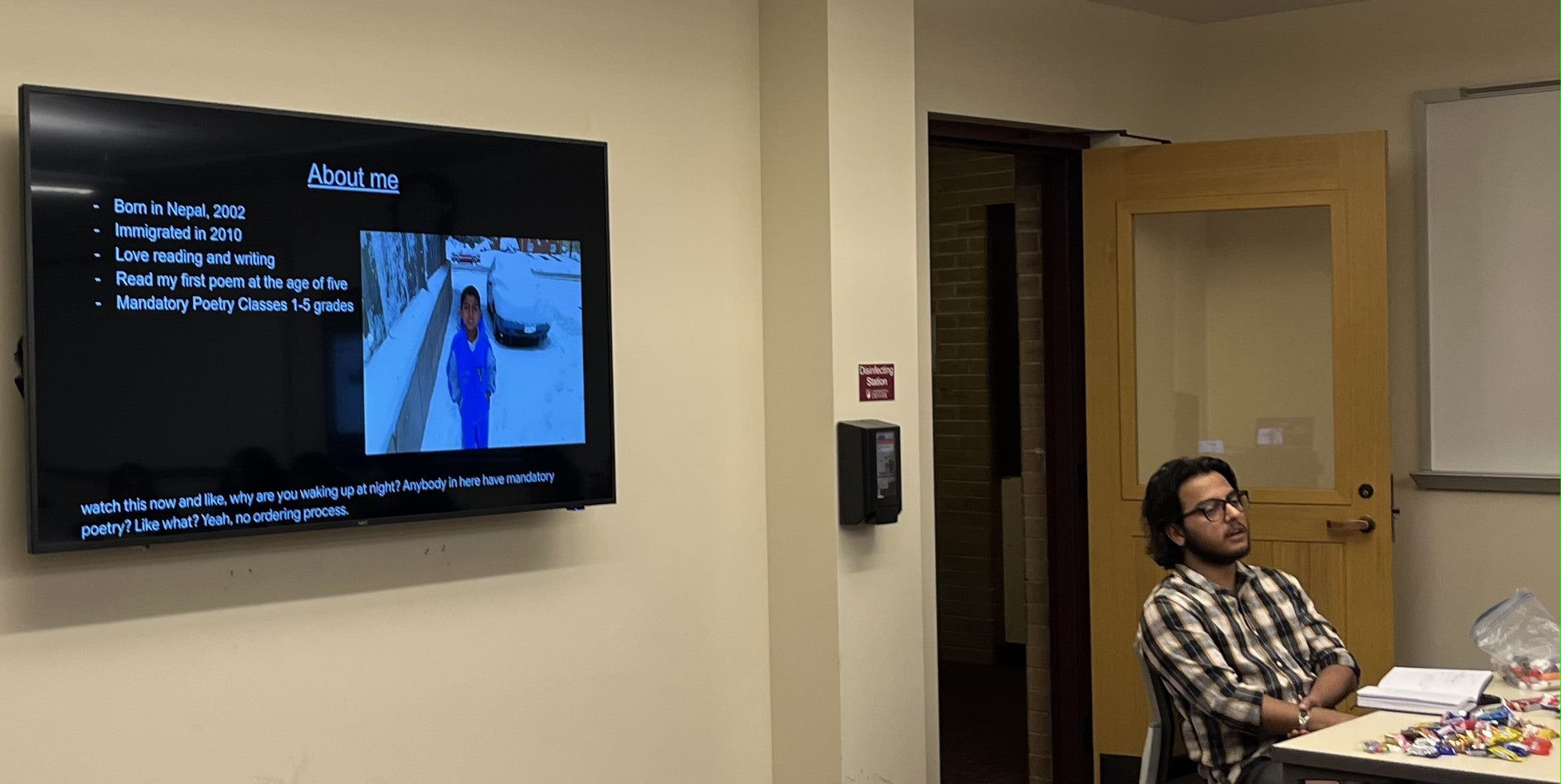 Students extended their understanding of linguistic choices in poetry by learning from student-collaborator Bedha Neopaney’s multinational experience with poetic forms. In his lesson, Bedha Neopaney reflected on his experience growing up with poetry, first in Nepal, and then in the US. Through modeling and guided questions, Bedha taught students to analyze poetry in light of specific cultural contexts. Students then practiced translating Old English to languages of their choice in order to experience the affordances and constraints of writing across historical, sociocultural, and political contexts. The image below shows Bedha describing the screen which shows him as a child in a blue tracksuit experiencing his first snow. Overall, Bedha’s lesson modeled how students can use personal experiences and knowledge across contexts, including cultures and languages, to understand how writing is rhetorically situated.