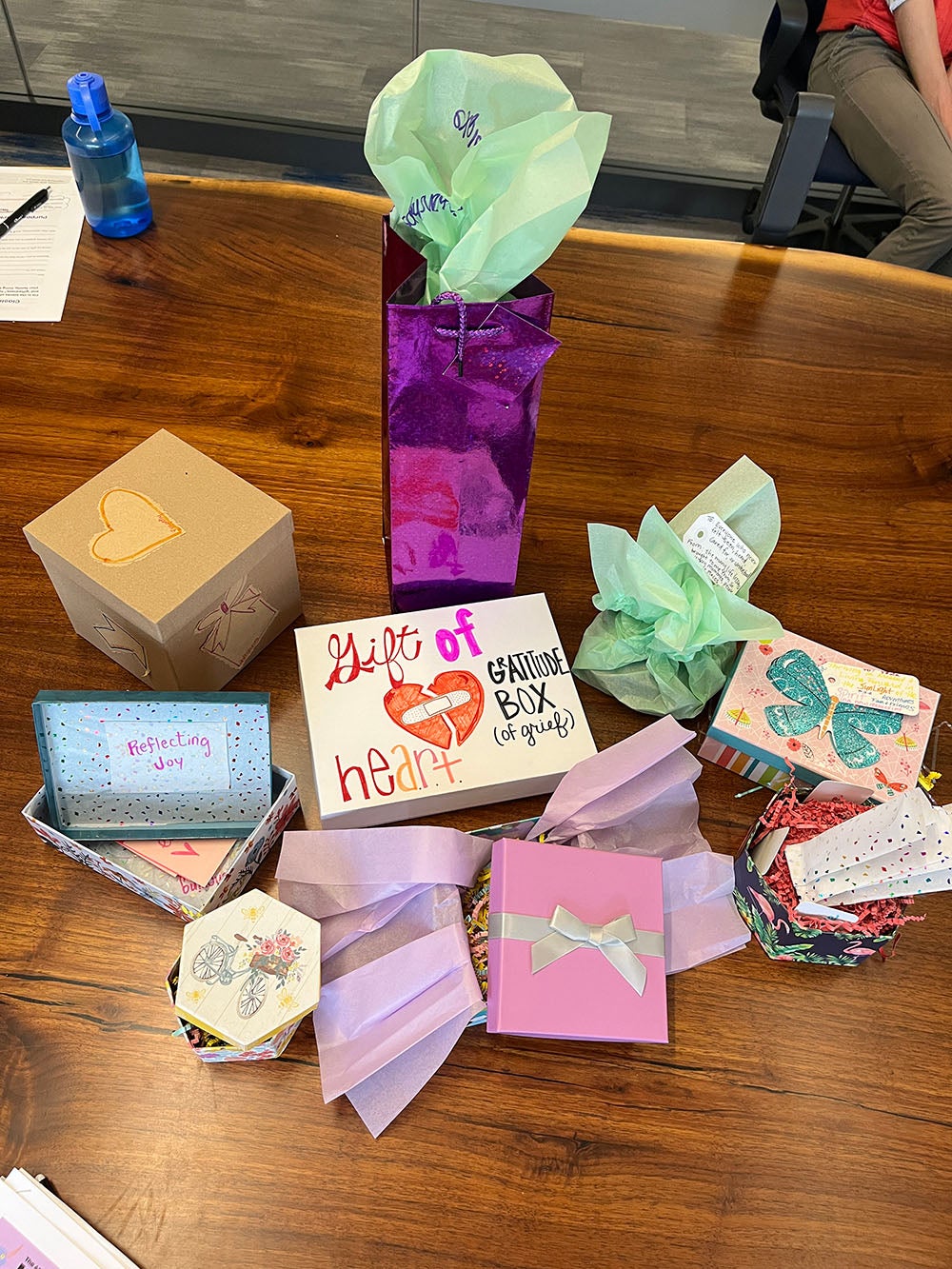 Supplies: A variety of gift-wrapping supplies (e.g., wrapping paper, gift box, bows, gift tags, tissue paper, variety of sizes of gift bags)
