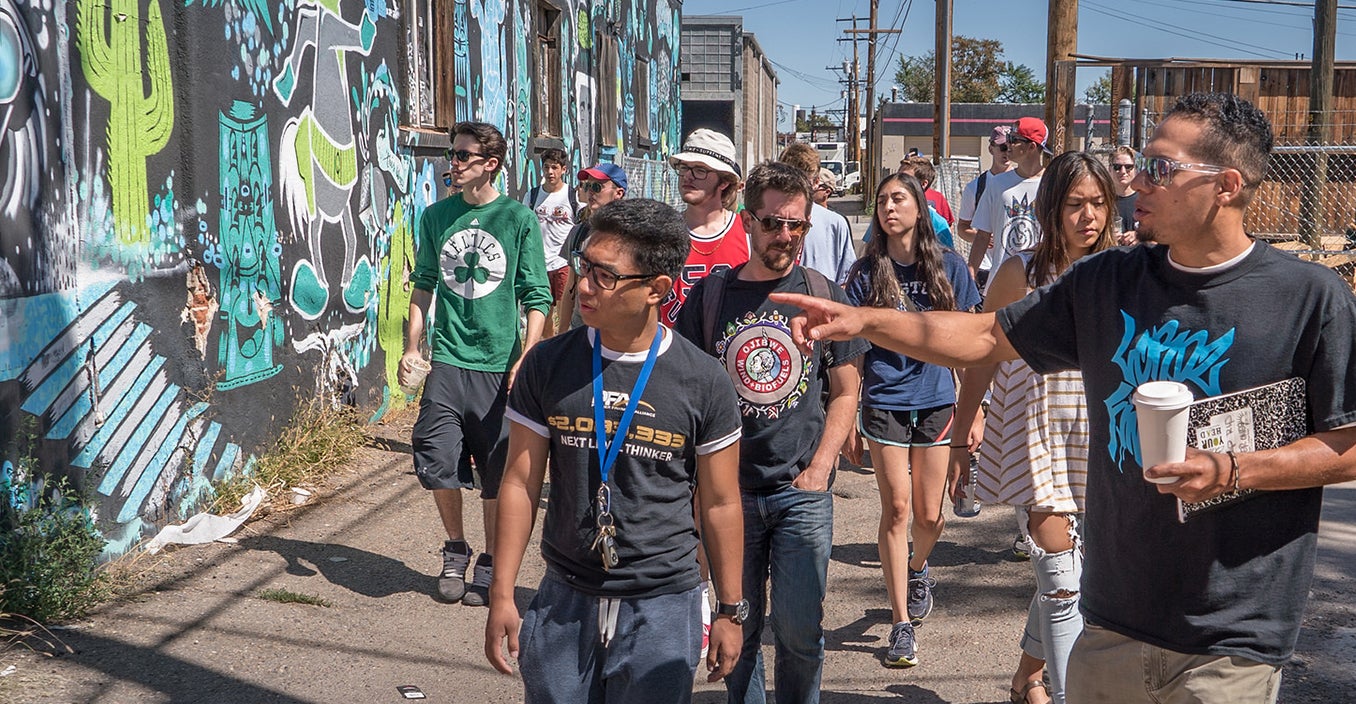 As part of a first-year seminar course on global hip-hop, DU freshmen tour Denver’s RiNo neighborhood to view examples of local street art.