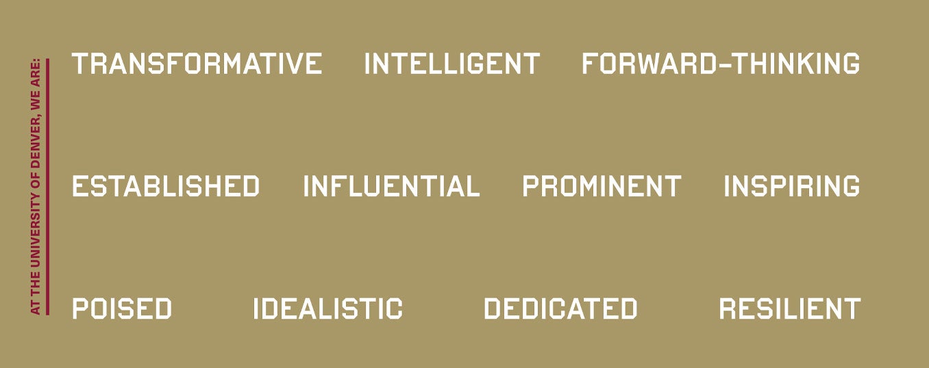 At the University of Denver, our brand reflects a spirit of exploration, innovation, and purpose. Rooted in the 4D Experience, nationally recognized research, and our unique location between downtown Denver and the Rocky Mountains, we prepare leaders to think boldly, act with intention, and create meaningful impact. United by community and driven by possibility, DU is where discovery, excellence, and purpose come together to shape a better future.