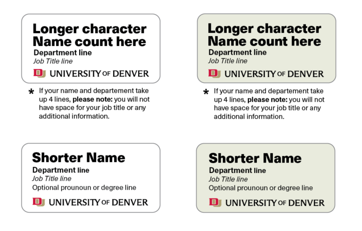 The examples below are just samples, but will show you the max amount of information that will fit on a badge to meet accessibility standards on font size and readability.