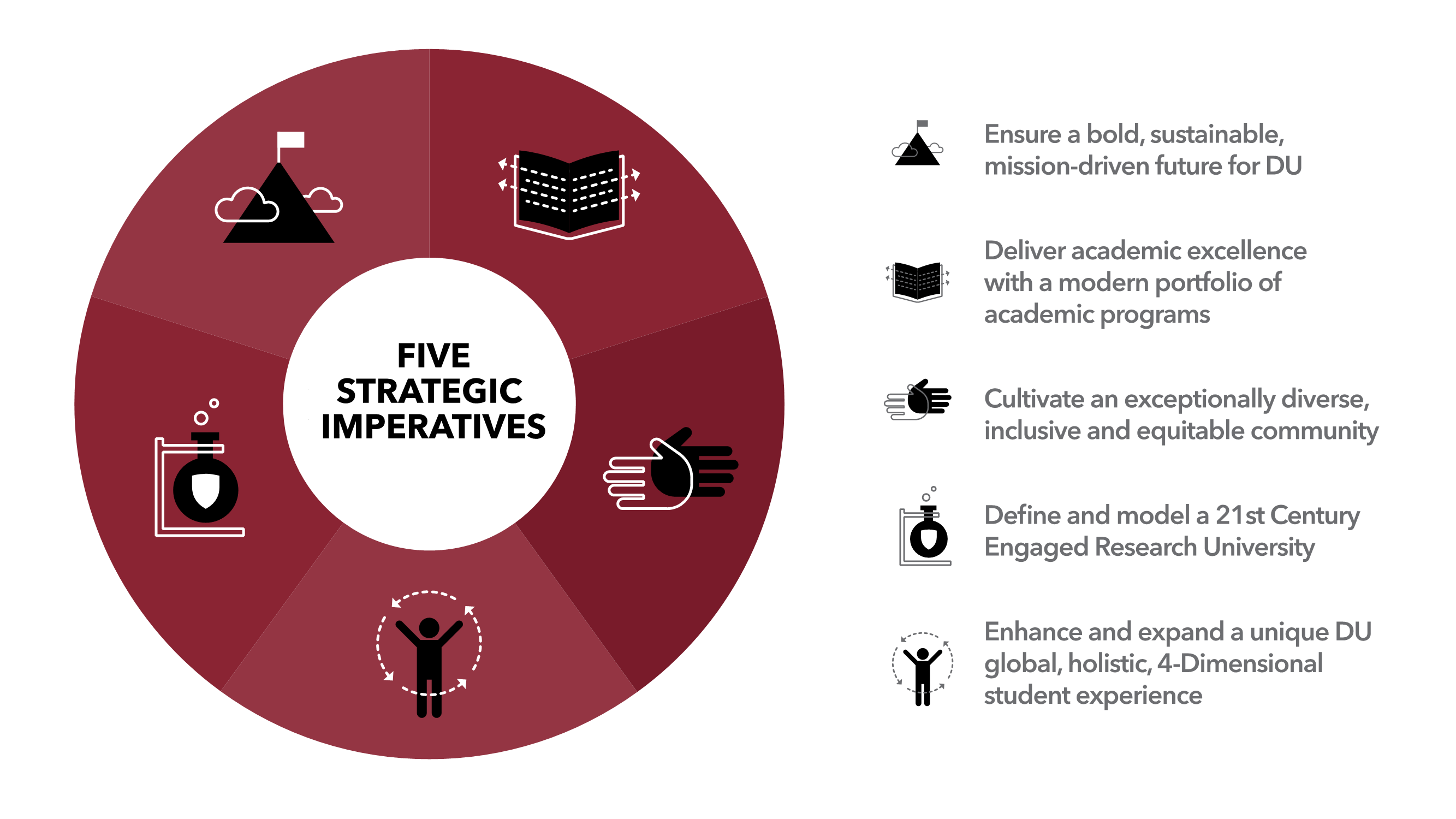 The context in which DU is surrounded is changing. High costs of living. Tuition expenses and the burden of student loans. Demographic shifts. Society’s perception of the value of a degree. New ways to obtain an education (are most students going to get their degrees online in 50 years? Maybe!) In this evolving context, DU needs to be nimble and innovative. And we need to see these new realities not as doom and gloom, but rather as opportunities. The five strategic imperatives are just that, opportunities for DU to become the next, best version of what we have always been: a great University committed to serving the public good.