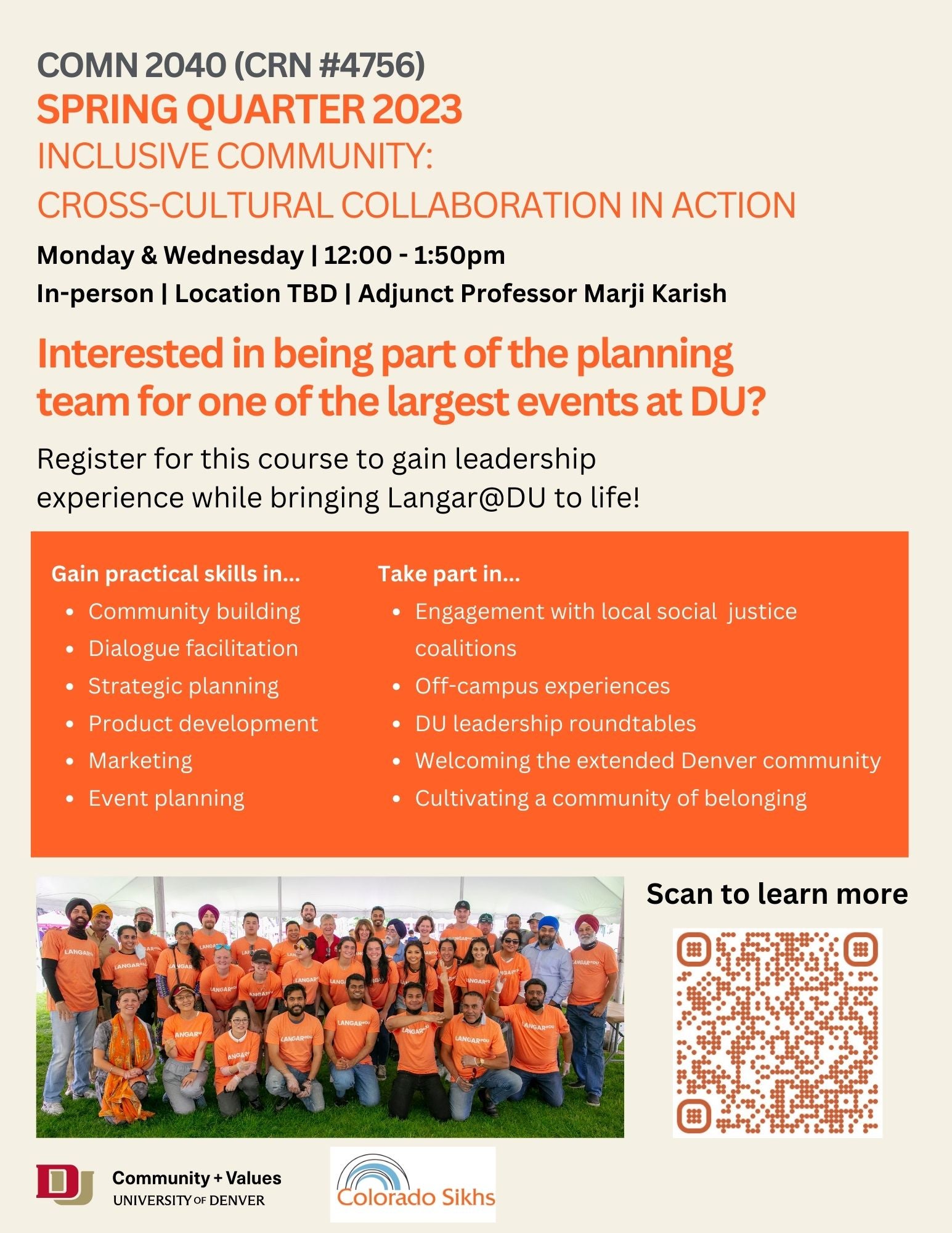 This course is an experience of cross-cultural collaboration and communication with internal DU partners and local community leaders. Through the encounters provided in the course, you will serve the public good and make a difference through unity and diversity modeled on the Sikh Langar, an expression of shared humanistic values in the public sphere resisting division, violence, and bigotry.