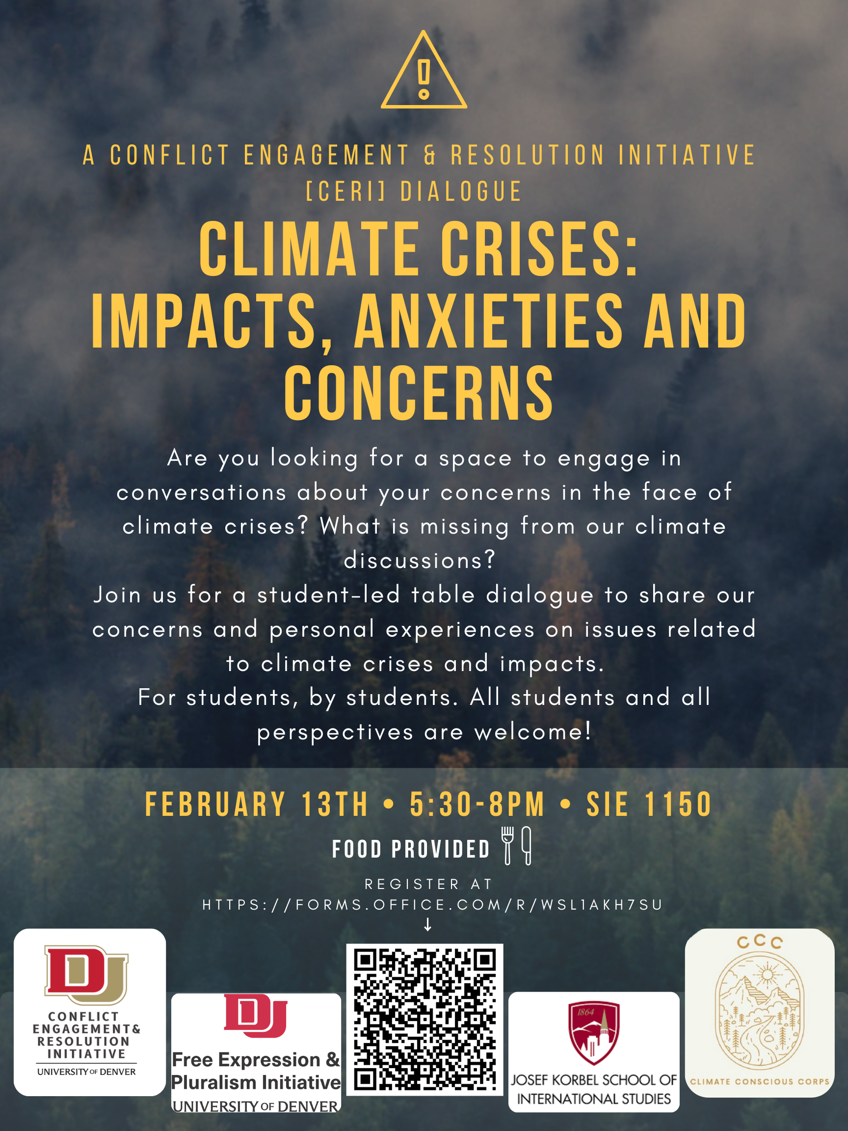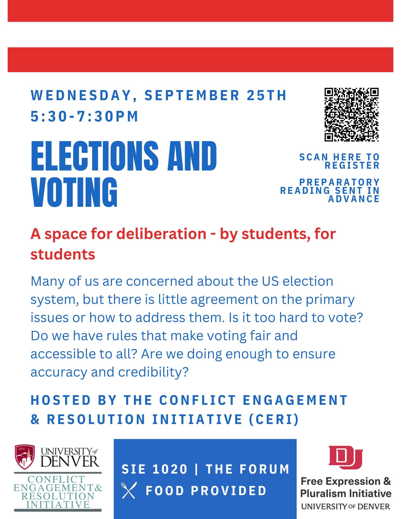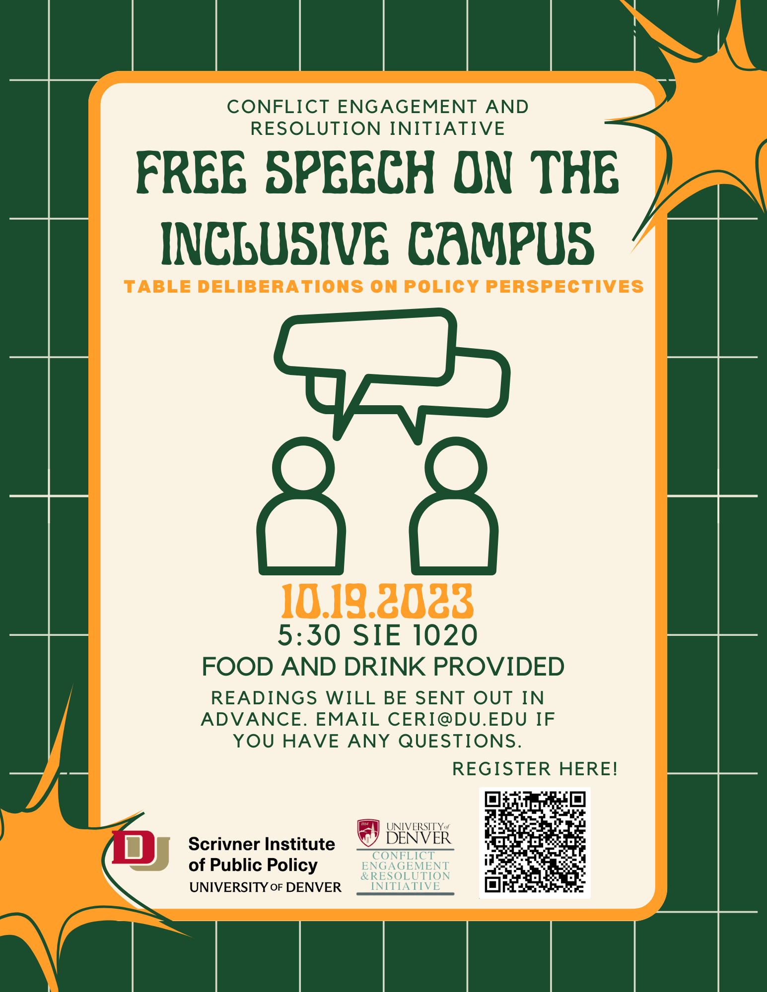 Join the Conflict Engagement and Resolution Initiative (CERI) on October 19, 2023, at 5:30pm in the Forum (SIE 1020) for student-facilitated table deliberations on policy perspectives on Free Speech on the Inclusive Campus. At this event, students will have an opportunity to discuss several policy proposals related to free expression and inclusivity, with the assistance of prereading materials. Food will be provided! Open to all DU students!