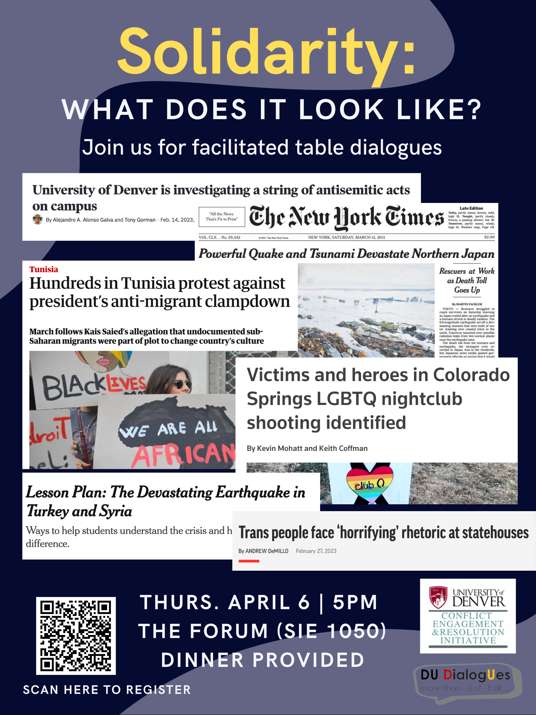 Join CERI for facilitated table dialogues on Solidarity and what it looks like. The dialogue will be held on Thursday, April 6, 2023, at 5PM in the The Forum (SIE 1050). Dinner will be provided!