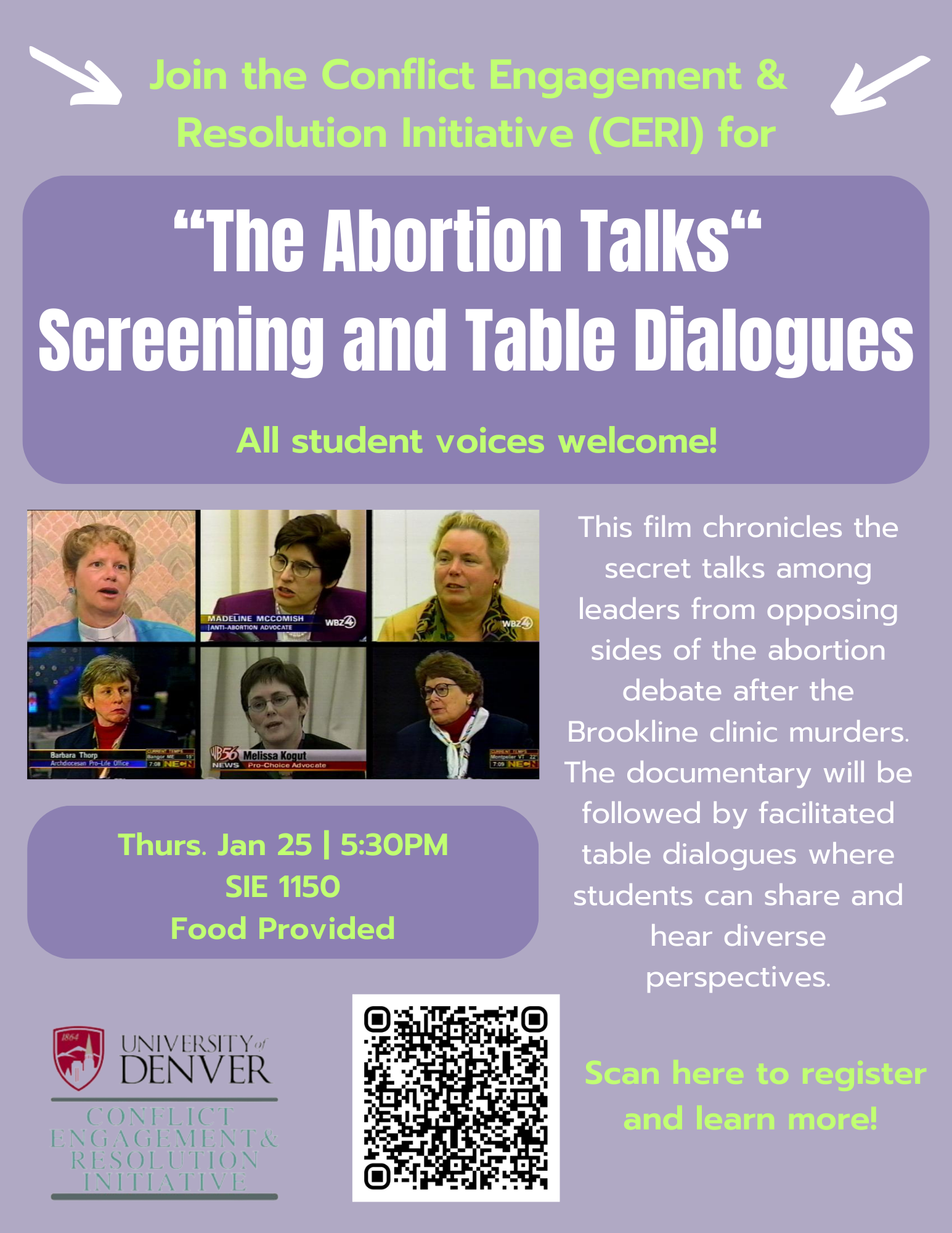 This was a screening of "The Abortion Talks," which chronicles the secret talks among leaders from opposing sides of the abortion debate after the Brookline clinic murders. This ground-breaking documentary will be followed by a facilitated, structured dialogue where students will have an opportunity to share their perspectives and listen to those of their peers.