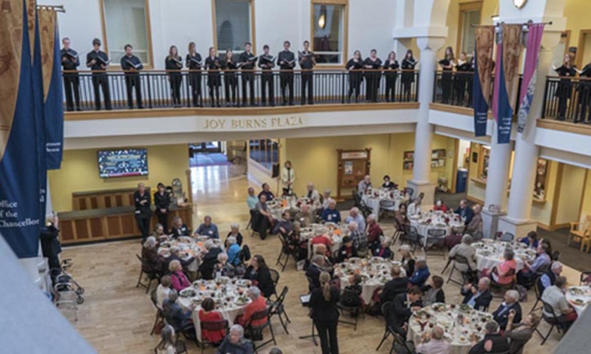 Joy Burns Plaza is the main lobby for the Newman Center for the Performing Arts. It also functions as a striking space for up to 300 persons standing or 210 persons seated. This elegant enclosed plaza features a high vaulted ceiling, transverse windows, an Italian travertine marble floor, double columns, artwork, and custom-designed alabaster chandeliers and wood furniture.