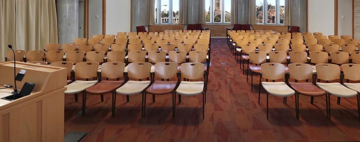 This is one of the most versatile rooms on campus and can be set in a variety of arrangements: classroom, boardroom, reception, or theater. This room features two screens for optimal viewing at all angles, a lovely stained glass window, and an attached kitchen making it easy for caterers to prep food.