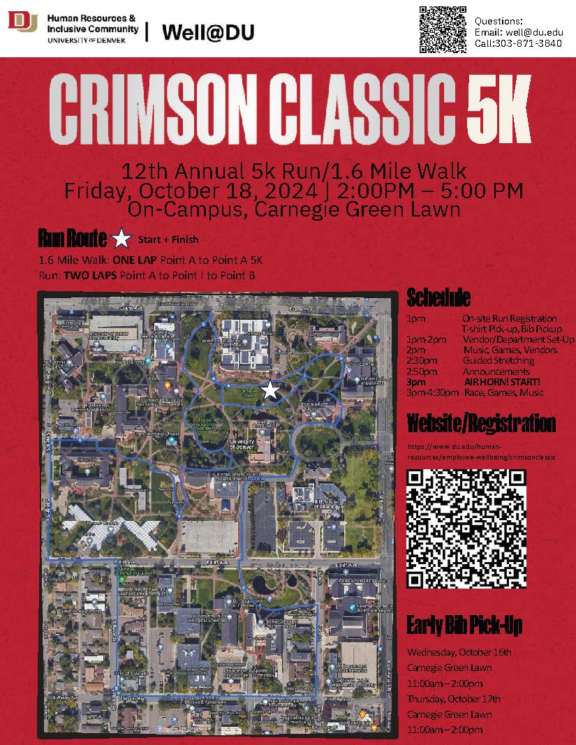 The University of Denver's 13th Annual Crimson Classic 5K Run/1.5 Mile Walk will take place on Wednesday October 22, 2025 on Carnegie Green Lawn.The focus of the Crimson Classic is to celebrate wellness and to bring together our community. This is a free event! Please scroll down for the day's schedule. All participants who register before October 1 will receive a 13th Annual Crimson Classic t-shirt. Thank You to our Generous Sponsors TIAA, Gallagher, Cigna, and Kaiser Permanente for helping to make this year's Crimson Classic 5k possible!