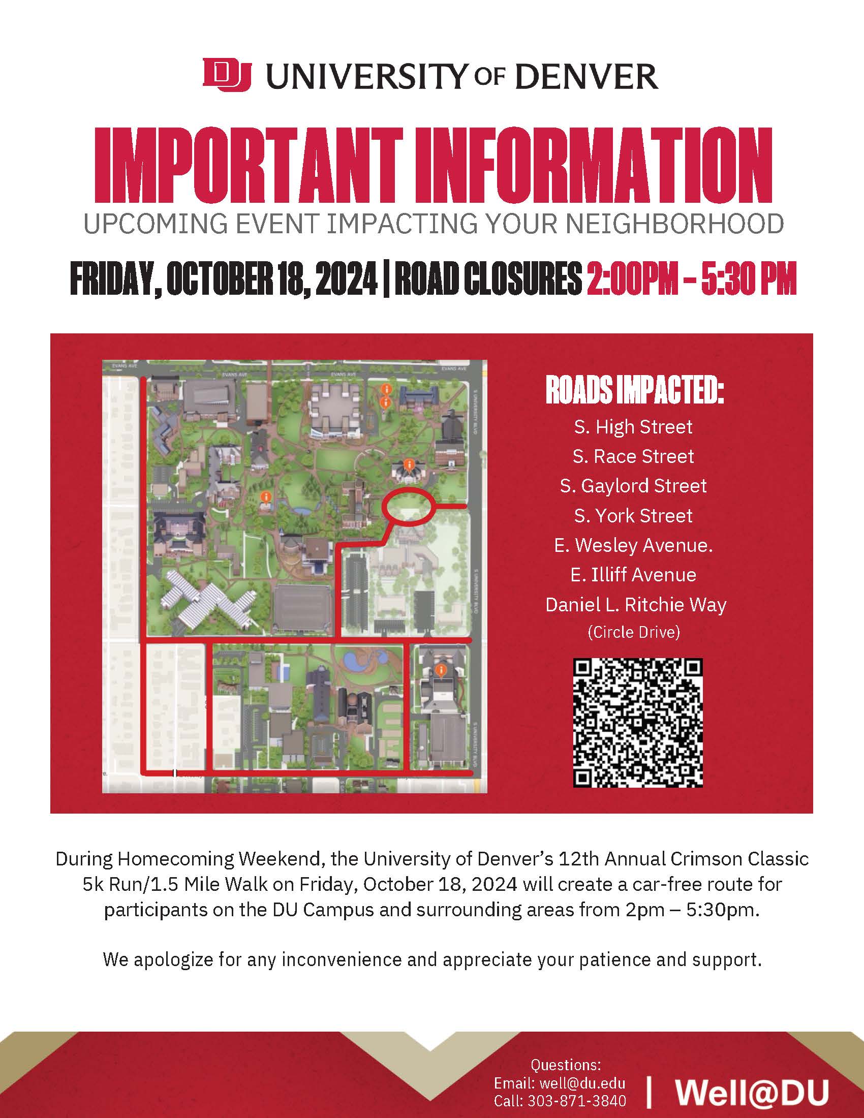 If you park in lots near these streets please reference the map below, Lot P will be available from 2:00pm-5:30pm for free if you cannot access your parking lot. Lot P is located off of University Blvd. and Wesley Ave. and will have open access University Blvd during the race time so you can leave campus during this time. Please contact Well@du.edu if you have additional questions about road closures during the race.