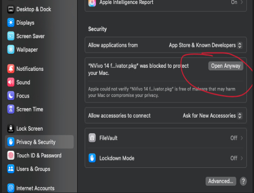 If you have a Mac, when running the .pkg file, you may need to go to Settings > Privacy & Security and click “Open Anyway” to run the licensing package (as pictured below).