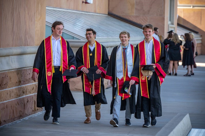 Two graduate commencement ceremonies will be held on June 14. The Crimson ceremony, at 9:30 a.m. in Magness Arena, includes the College of Arts, Humanities & Social Sciences; the Daniels College of Business; the DU/Iliff School of Theology Joint Doctoral Program; the Graduate School of Professional Psychology; the Korbel School of International Studies; and the Morgridge College of Education. The Gold ceremony, at 2:30 p.m., includes the College of Natural Sciences & Mathematics; the Graduate School of Social Work; the Ritchie School of Engineering & Computer Science; and University College.