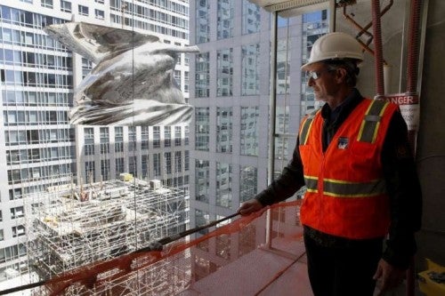 Lawrence Argent watches as crews assemble his new sculpture in San Francisco, California. Courtesy: sfgate.com