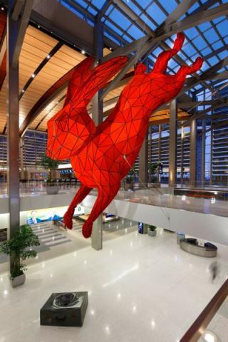 Since the blue bear’s debut in downtown Denver, Argent’s public art projects have only become larger in size. There’s “Leap” inside the baggage claim area in the Sacramento Airport. It’s a giant 56-foot red rabbit that signifies the feelings and emotions travelers feel when going through an airport’s baggage claim area. Who doesn’t love a cute panda? “I Am Here” is on display outside the International Financial Square in China. The giant panda is about 45 feet high and weighs 13 tons.