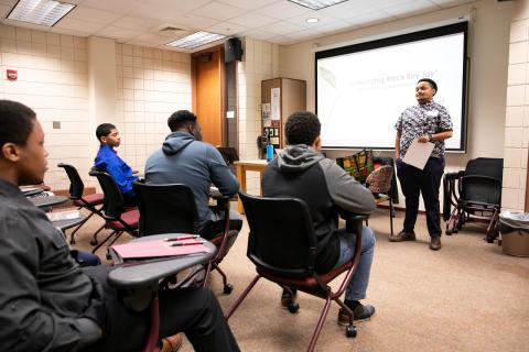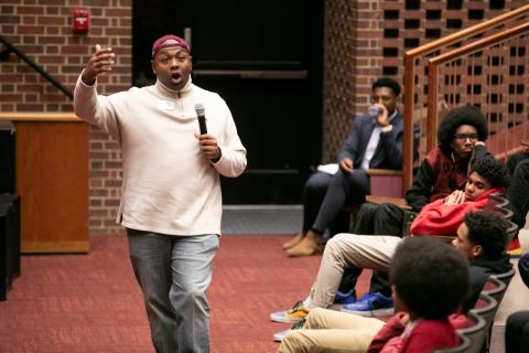 On the final day of Black History Month, 105 boys are ready for a full day of mastering their fate. In the morning, they sat in small groups, sharing stories of discrimination and feeling different. Facilitators (often DU students, alumni and members of the community) guided the discussion, pushing the boys to examine the “cycle of socialization” that shapes their experience through harmful, tired narratives about black men.