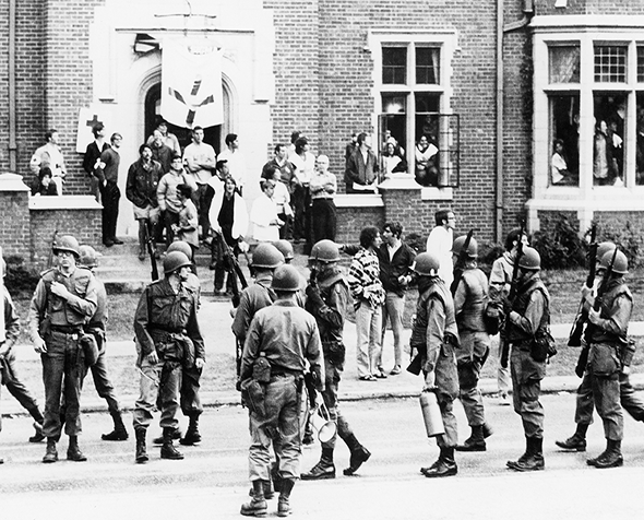 Unable or unwilling to concede on the permanent residential area, Mitchell contacted the governor later that night to say that he no longer had control of the situation on campus. Some 1,000 National Guardsmen—many of whom were current students—arrived on campus the next morning, with bayonets and live ammunition, to oversee the final destruction of Woodstock West.