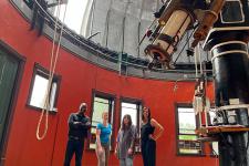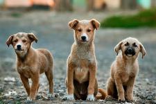Four laptops open on a table with notebooks, phones, hard drives and coffee cups