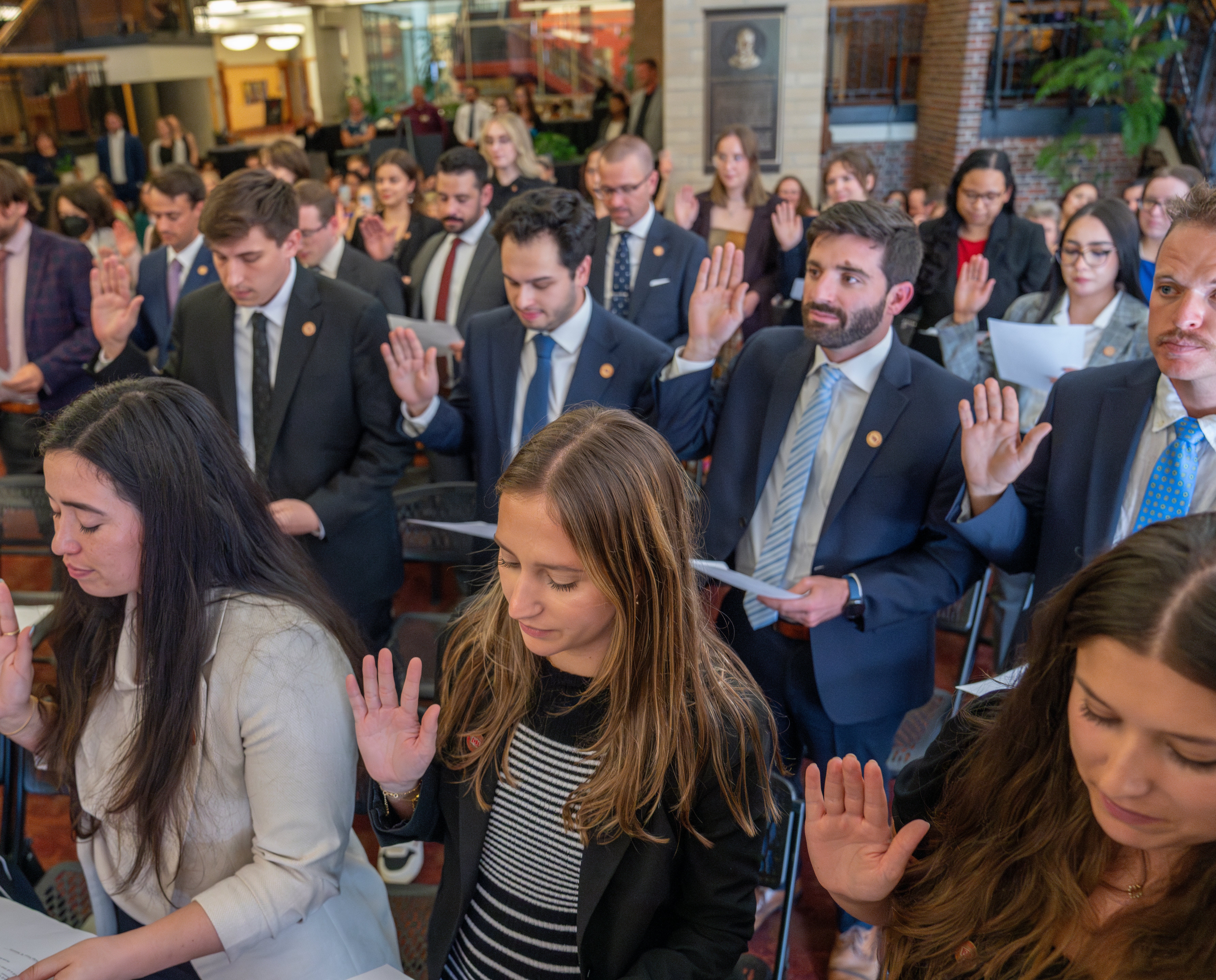 A group of Sturm law students hold up their right hands as they are sworn in as new student attorneys for the Student Law Office.