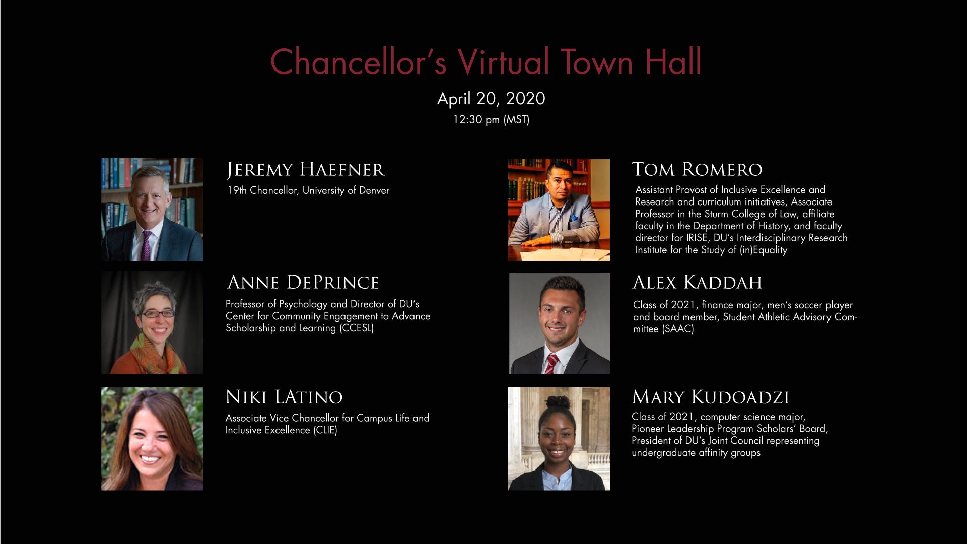 You are welcome to send questions in advance to chancellor@du.edu.
