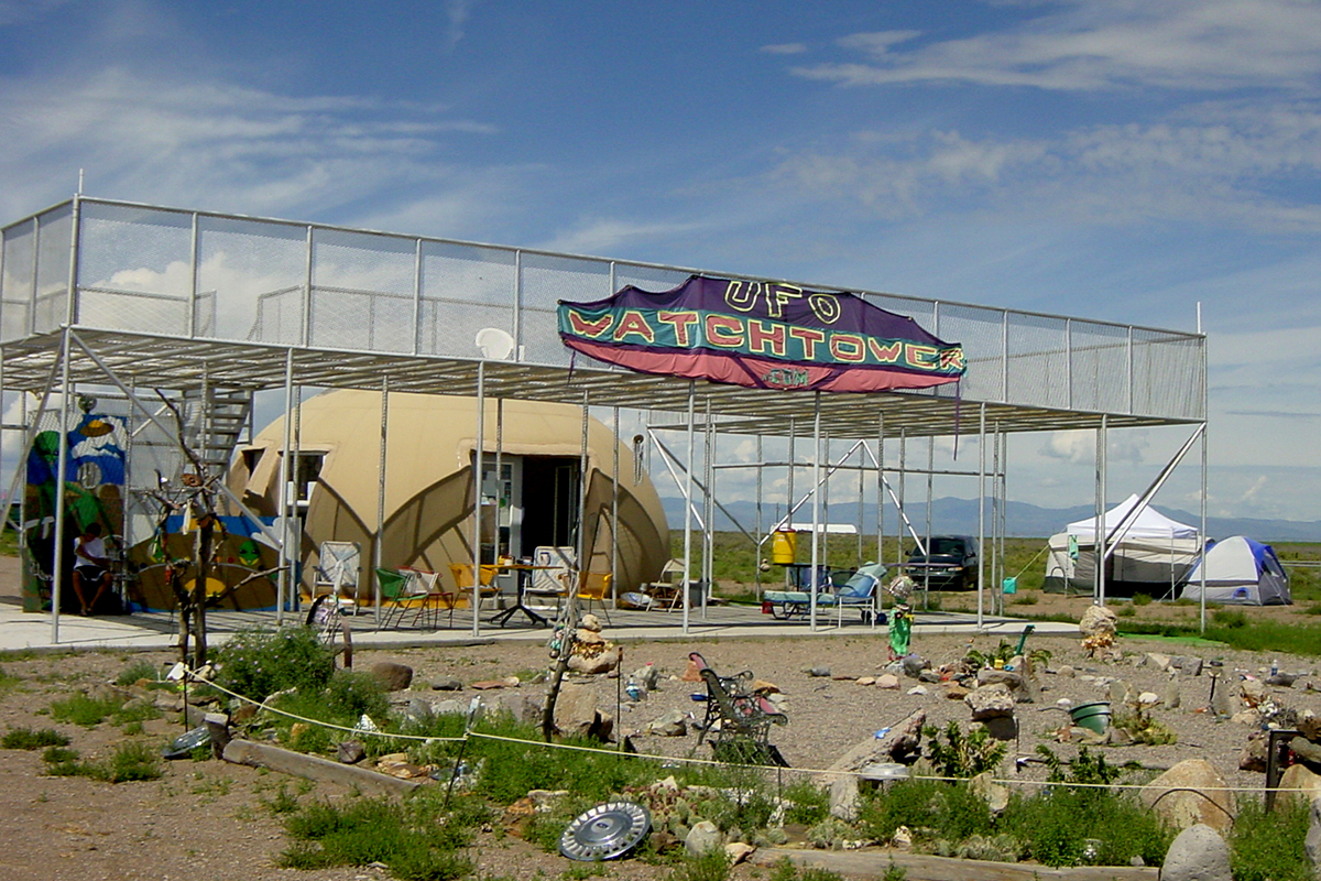 Surrounded by miles of nothing, the UFO Watchtower sticks out from the terrain, with a raised viewing platform and alien-themed sculpture garden.