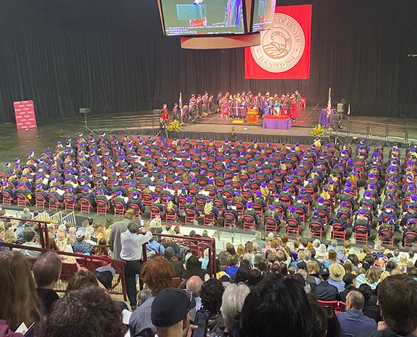 The through lines for the Sturm College of Law commencement on Saturday were social justice, compassion and community focus. Those themes were carried throughout numerous speakers from inside and outside the Denver Law community as hundreds gathered in Magness Arena to celebrate the class of future lawyers and legal professionals.