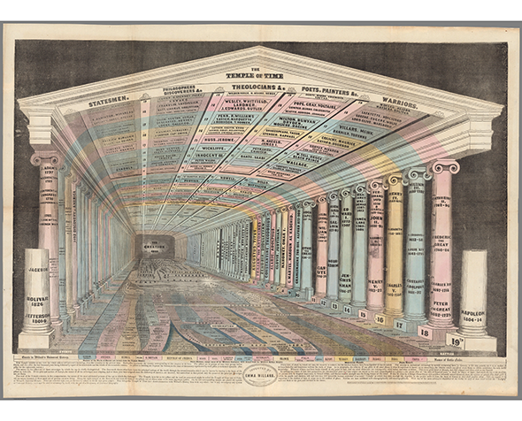 Willard’s graphic output grew directly out of her classroom experience. She began with the simple step of having students draw maps of the past, and that shaped her conviction that when students draw, they remember. She rapidly scaled up her approach through published atlases, textbooks and other materials. Her first illustration of time pictured the history of the Roman Empire as a massive river system. Perhaps the most stunning and mind-bending of these images is the Temple of Time, designed in the 1840s to capture the totality of human history on a single page. Willard foregrounded visual techniques such as this to help a wider population of students learn in an era of accelerating information. Spread over 40 years, her prodigious output reveals a woman who was reckoning with the very meaning of time and space in an era of expansion, dislocation and war.
