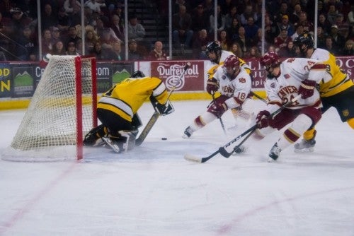 “It’s great to end our home schedule with a good team win like this, and we’re looking forward to the challenge of competing for another Frozen Faceoff title next weekend in Minneapolis,” said head coach Jim Montgomery after Saturday night’s victory.