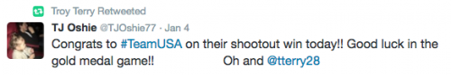 The team advanced to the championship game against Canada, where it was almost déjà vu all over again. The teams skated to a 4-4 tie and went into a shootout. This time only one goal was scored between both teams. Terry had that lone goal.