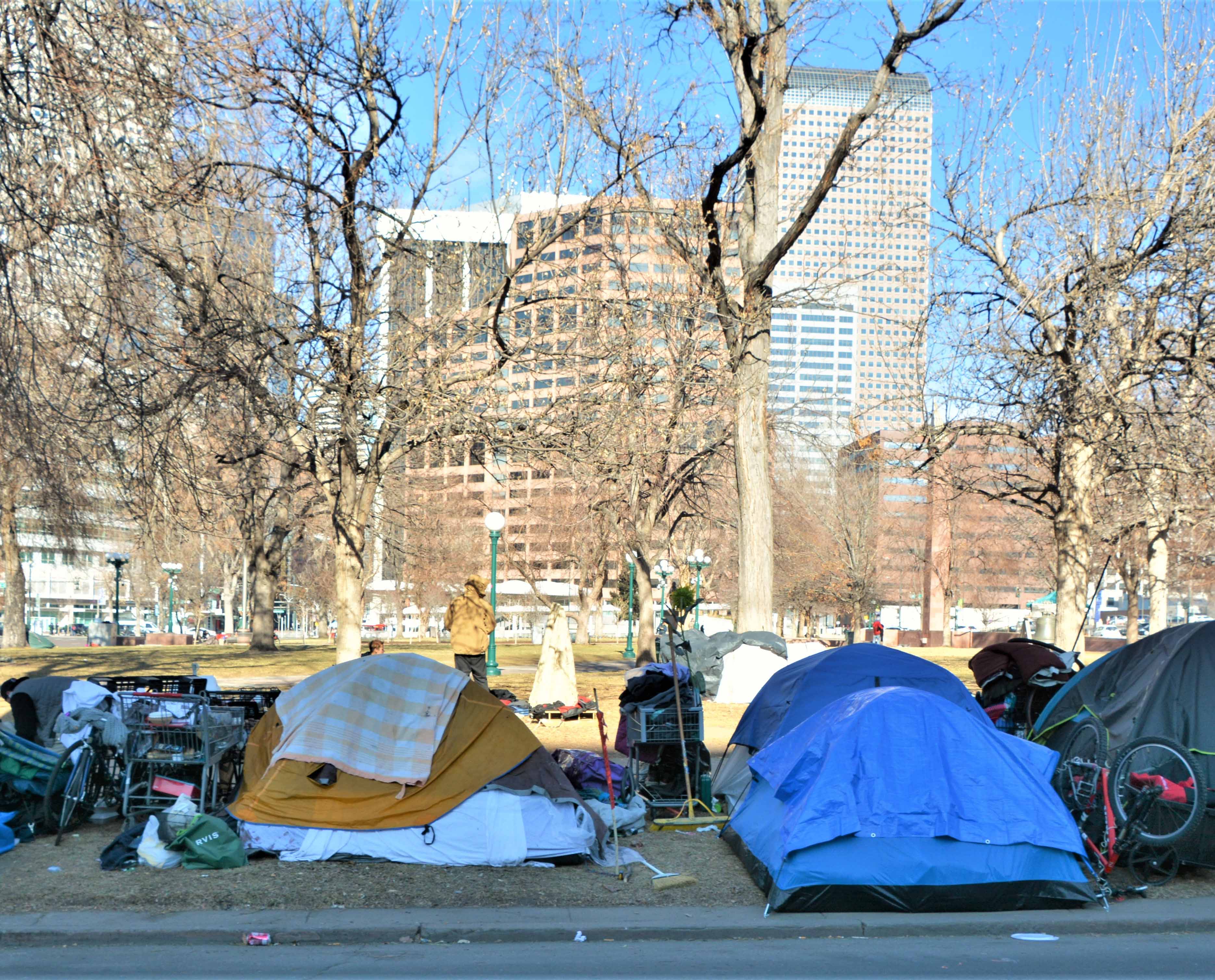 Unhoused people and their tents in downtown Denver.