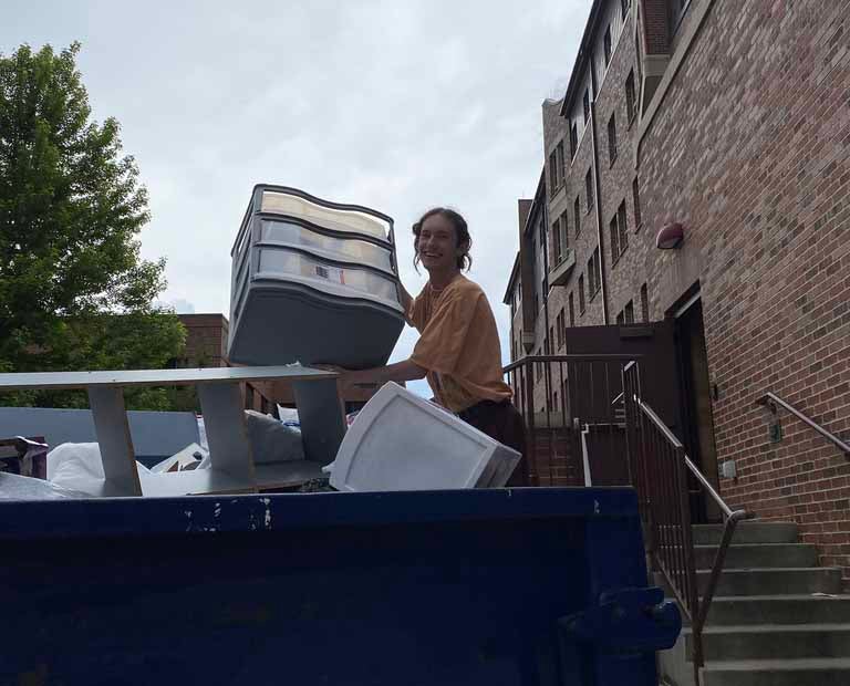DU Sustainability Intern Jacob Tonozzi, rescuing a lightly used storage container from the dumpster during last year's Move Out.