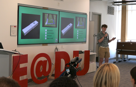 Finance student Jack Cambruzzi pitched his golf training aide, the Backswing Buddy—a perfect tool for the 20% of golfers that over-rotate their backswing. When placed between a golfer’s feet, the Backswing Buddy corrects their stance and swing.