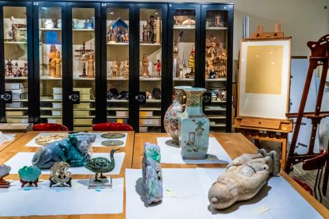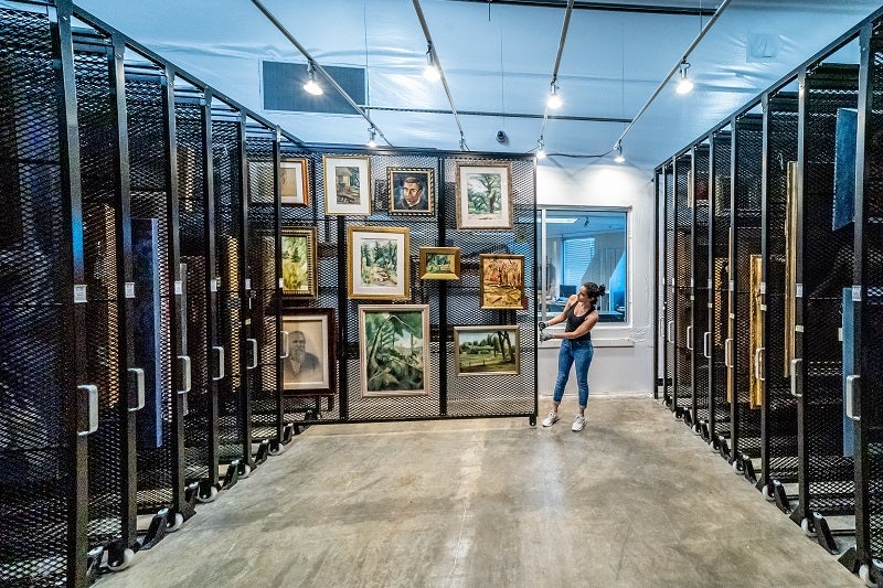 “You really get to see the breadth of what we have,” Kerr says, walking through a warehouse in the 4,000-square-foot, climate-controlled space. She gestures to the top shelf. “Our whole concept here is accessibility for students and for researchers. All of these pieces can be accessed with our library ladder. A staff member could go up and pull most of those pieces on the top shelf by themselves.”