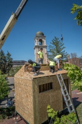 Graduation Green outside the Margery Reed Building was transformed last Friday into a construction zone as students started building a tiny house. This is the fourth year Burns students have built projects on campus. In previous years, they have constructed full-size playhouses to donate to families in need.