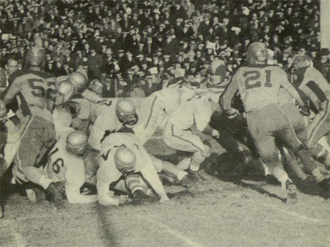 During halftime of the 1959 football game, the DU marching band performed in the styles of bands from across the country. They marched to the song “D-Rah” in waltz, stop, cha-cha and Dixie-land tempos.
