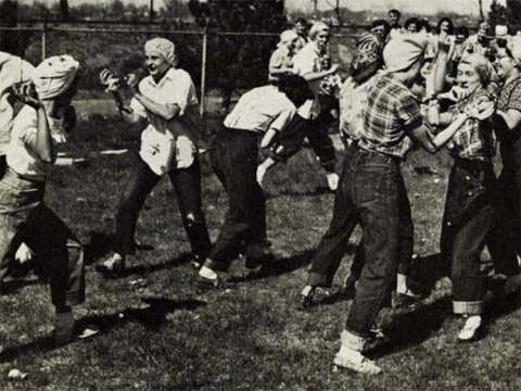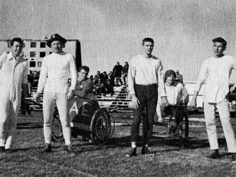 Students on campus have participated in a wide variety of activities that became associated with Homecoming. Starting in the 1920s, there was an annual dance that the entire University would participate in. Around this same time students held the “class fight.” The freshman and sophomore classes would battle for supremacy during Homecoming. Students would often go head-to-head in four events: potato sack race, tug-of-war, flag rush and the ripe-vegetable fight. Beginning in the 1930s the fraternities would compete in chariot races. In the annual beard-growing contest, two styles were permitted — the Abraham Lincoln and the Van Dyke — and all entries had to be self-trimmed. On at least one occasion the winner received a free razor.