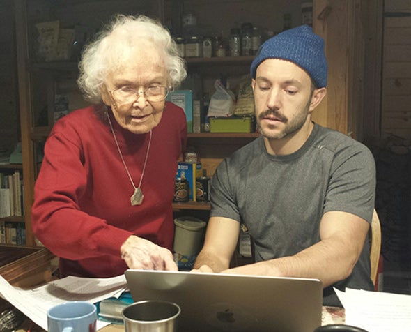 Aak'w Wooshkeetaan elder Marie Olson (Kaayistaan) and Ryan Conarro revise an audio script for the Juneau Voices project. Photo by Lillian Petershoare