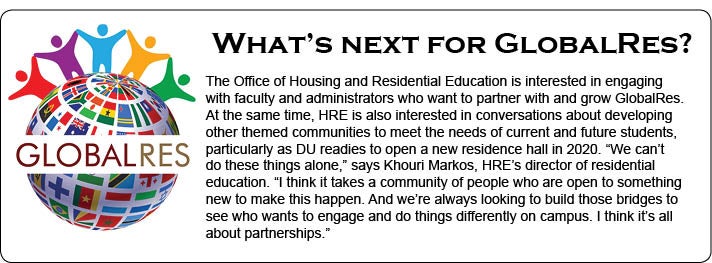 Welcome to orientation day for the sixth iteration of GlobalRes, a sophomore living community targeted at DU’s robust international student body (boasting 1,027 undergraduate and graduate students from 81 countries) and domestic students eager to broaden their horizons.