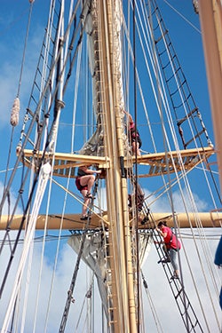 Ironically, McKenna’s journey to the South Pacific began in the Northeast—in Woods Hole, Massachusetts. For six days a week for six weeks, she and her classmates took classes in oceanography and chemistry to prepare for their semester researching sustainability in Polynesian island cultures and ecosystems. During that time, they faced another daunting challenge: learning the skills needed to command the 120-foot brigantine sailboat that would become their home for the next nine weeks.