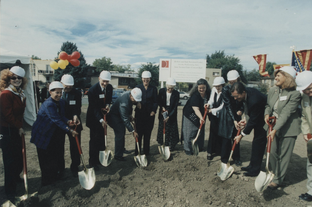 DU administrators dig into the dirt to mark the groundbreaking for the new Newman Center for the Performing Arts in the year 2000.