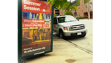 A summer flight of OOH advertisements successfully launched in June, reinforcing University messaging to a general brand audience. DU is now actively building brand affinity in the Denver community through displays on bus shelters near campus, kiosks in Cherry Creek Shopping Center and Southwest Plaza, and a refreshed ad set on RTD buses and light rail. These placements are staggered, with the latest running through September 17.