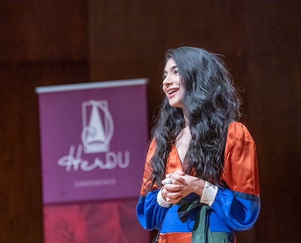 Shahid shared her powerful story in a keynote address delivered at the March 6 HerDU conference at Sturm Hall. Her story and topic — the significance of showing up and the importance of education for young girls and women — moved so many people that she was met with a standing ovation.