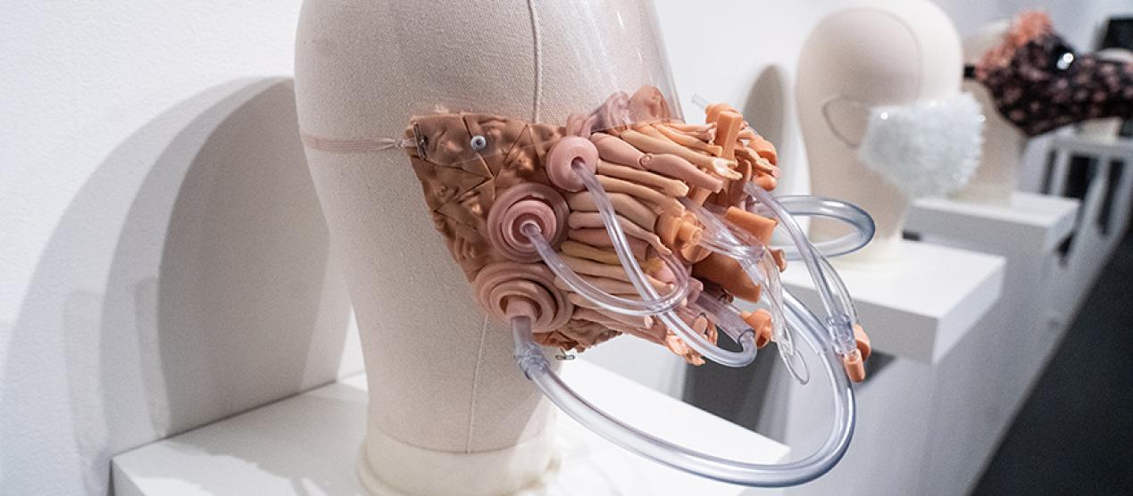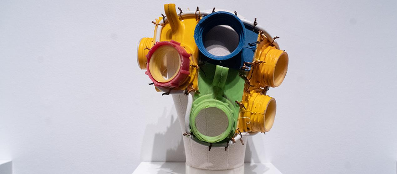 The rest are by local artists, including DU’s own Christopher Coleman, a professor in the Emergent Digital Practices program. Coleman’s 3D-printed piece, “Contact,” considers the absence of intimate greetings. The mask he created allows two people to stand cheek-to-cheek, separated only by a thin membrane, while long tubes whisk exhalations 6 feet in either direction