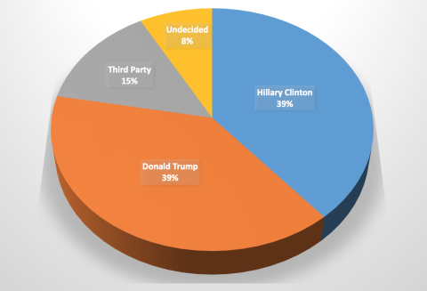 The Crossley Center for Public Opinion Research in the Josef Korbel School of International Studies released the new poll numbers on Wednesday. The survey of 550 registered likely voters in Colorado shows Clinton and Trump deadlocked at 39 percent. Third-party candidates combine for 15 percent and another 8 percent are undecided. The survey was conducted Oct. 29 – 31 and has a margin of error of plus-or-minus 4.2 percent.