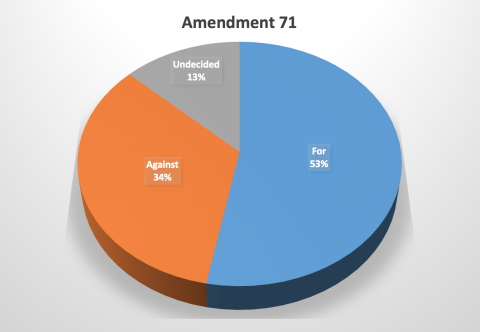 An amendment to make it more difficult to amend the Colorado Constitution also appears to be on its way to passing. Amendment 71 would require signatures from at least 2 percent of all voters in each of the state’s 35 senate districts. In addition, the measure would require approval from 55 percent of voters in an election to amend the state constitution. Fifty-three percent of those polled are in favor of the passage of Amendment 71.
