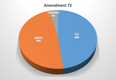 Voters are deadlocked at 48 percent on the cigarette tax. Amendment 72 calls for taxes on a pack of cigarettes to increase from 84 cents per pack to $2.59 per pack. The tax on other tobacco products would increase by 22 percent of the manufacturer’s list price.