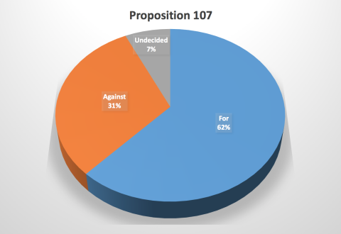 Also poised for passage is Proposition 107 with 62 percent in favor and 31 percent against. It would create a presidential primary election before the end of March in presidential election years and allow unaffiliated voters to participate without declaring membership in a political party.