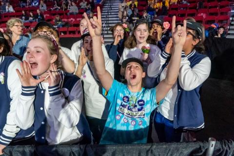 Magness Arena is in such a frenzy, the eye doesn’t know where to focus. The main attraction is the annual FIRST Robotics competition that brings Colorado high schoolers to the University of Denver campus. But the stands are a palette of painted faces, dancing mascots and screaming students.