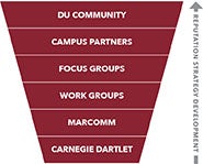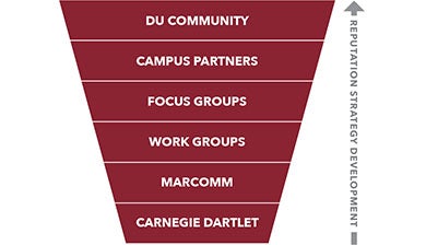 Carnegie Dartlet, an external agency partnered with us, led us through the initial research and audience insights to inform our brand planning. Now MarComm is assuming the responsibility and final development necessary to implement the work. One of the ways this will happen is through work groups, consisting of MarComm staff and unit communicators focused on the development of our brand’s messaging, visual identity, advertising campaign, and campus toolkit/services. Additionally, regularly convened focus groups, comprised of representation from each of our brand owner categories and internal stakeholders, along with our partners in the Communicators' Roundtable, a fairly large group consisting of anyone with a communications or marketing role at DU, will be invited on the journey and be able to offer feedback and insights throughout. Finally, the entirety of our DU community (faculty, staff, students, alumni) will be introduced to the work through the rollout over the coming months.