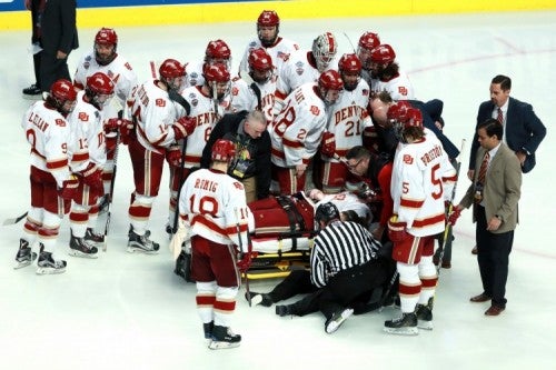 The third period became a case of DU doing everything it could to hang on for the victory. Only a few minutes in, junior defenseman Tariq Hammond had to be taken off the ice on a stretcher after suffering an apparent broken ankle.