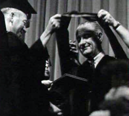 1966: President Lyndon Johnson received an honorary degree at the summer Commencement ceremony on Aug. 26 in the DU Arena.